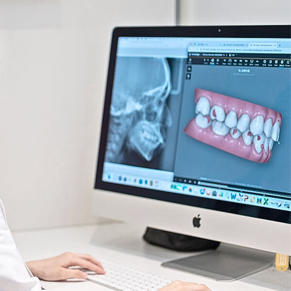 様々なケースを想定し、一本一本の歯に対して動かすタイミングや方向を0.1mm単位で調整しながら、繰り返しシミュレーションを実施。患者さまにふさわしい矯正計画を作りあげます。