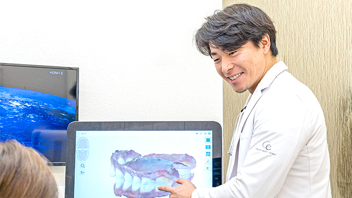 院長がお口の診察を行い、続いて口腔内スキャナー「iTero(アイテロ)」を使って、患者さまの歯をスキャンします。